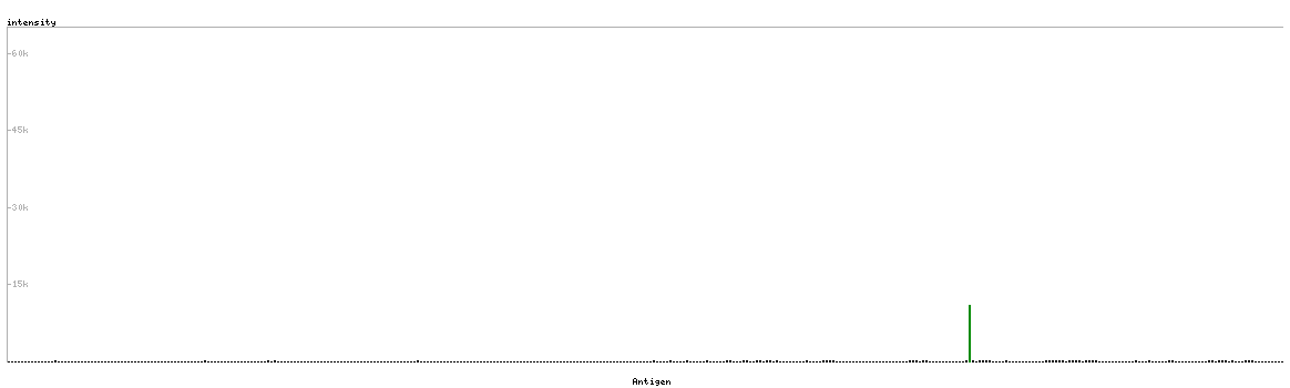 At the top of the view, the position of the antigen (identified by the corresponding HPA identifier) is shown as a green bar. A yellow triangle on the bar indicates a <100% sequence identity to the protein target.