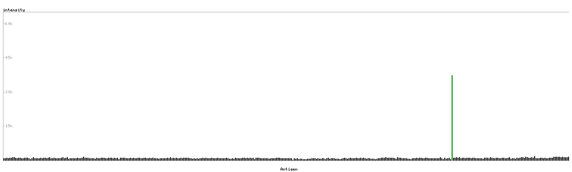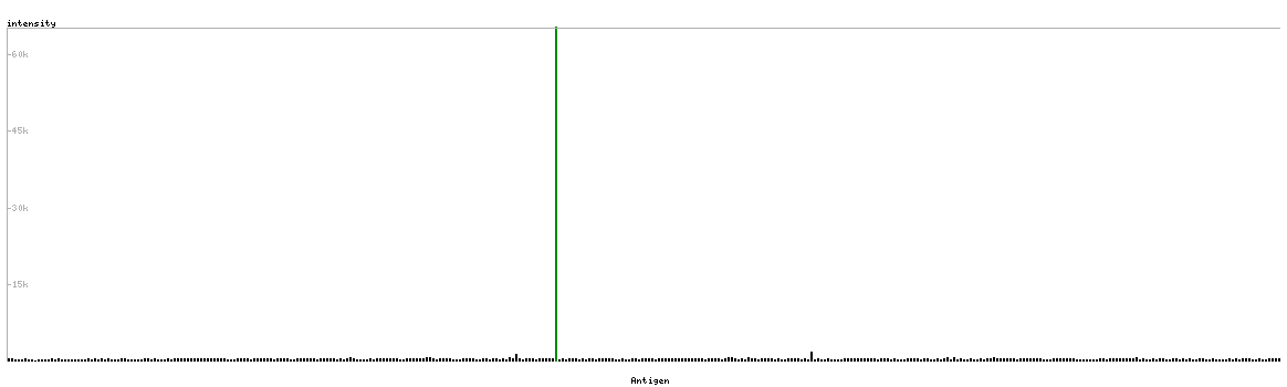 At the top of the view, the position of the antigen (identified by the corresponding HPA identifier) is shown as a green bar. A yellow triangle on the bar indicates a <100% sequence identity to the protein target.