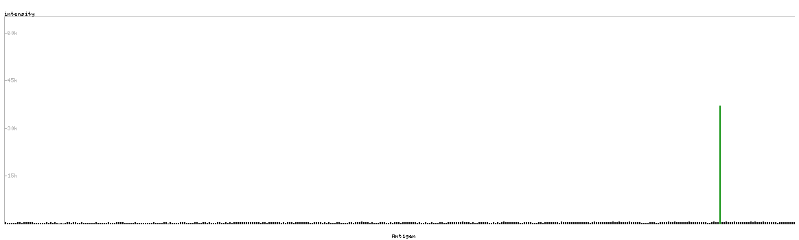 At the top of the view, the position of the antigen (identified by the corresponding HPA identifier) is shown as a green bar. A yellow triangle on the bar indicates a <100% sequence identity to the protein target.