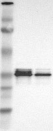 Band of predicted size in kDa (+/-20%) with additional bands present. Analysis performed using a standard panel of samples.