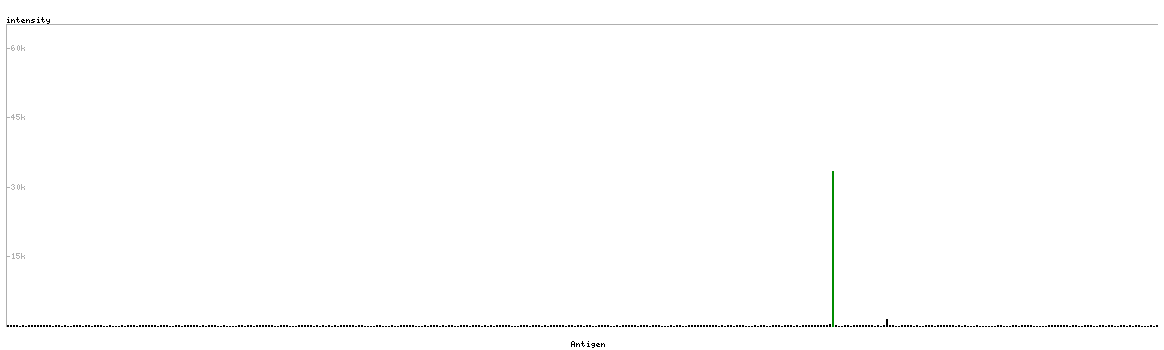 At the top of the view, the position of the antigen (identified by the corresponding HPA identifier) is shown as a green bar. A yellow triangle on the bar indicates a <100% sequence identity to the protein target.