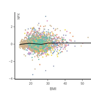 Blood protein levels by age, BMI, and sex, measured using the proximity extension assay (PEA) with the Olink Explore 1536. In the age and sex scatterplots, samples are colored by disease class.