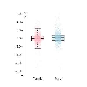 Blood protein levels in 96 healthy adults (aged 50–65) measured at six visits over a two-year period, shown separately for males and females. Relative protein abundances were quantified using the proximity extension assay (PEA) with the Olink Explore HT.