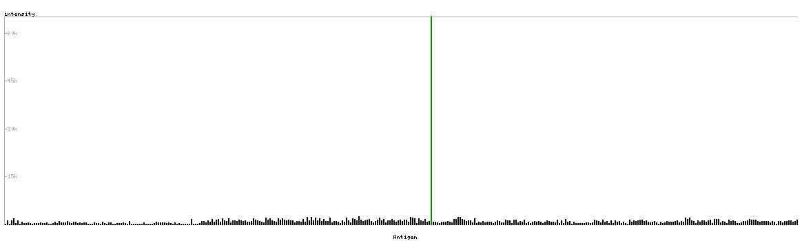 At the top of the view, the position of the antigen (identified by the corresponding HPA identifier) is shown as a green bar. A yellow triangle on the bar indicates a <100% sequence identity to the protein target.