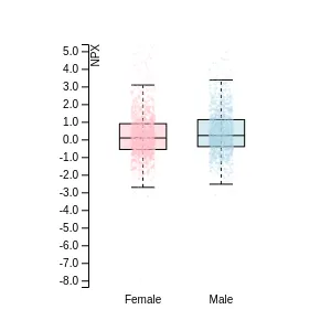 Blood protein levels in 96 healthy adults (aged 50–65) measured at six visits over a two-year period, shown separately for males and females. Relative protein abundances were quantified using the proximity extension assay (PEA) with the Olink Explore HT.