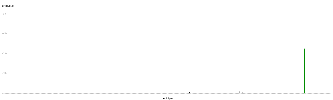 At the top of the view, the position of the antigen (identified by the corresponding HPA identifier) is shown as a green bar. A yellow triangle on the bar indicates a <100% sequence identity to the protein target.