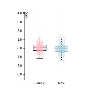 Blood protein levels in 96 healthy adults (aged 50–65) measured at six visits over a two-year period, shown separately for males and females. Relative protein abundances were quantified using the proximity extension assay (PEA) with the Olink Explore HT.
