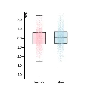 Blood protein levels in 96 healthy adults (aged 50–65) measured at six visits over a two-year period, shown separately for males and females. Relative protein abundances were quantified using the proximity extension assay (PEA) with the Olink Explore HT.