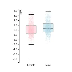 Blood protein levels in 96 healthy adults (aged 50–65) measured at six visits over a two-year period, shown separately for males and females. Relative protein abundances were quantified using the proximity extension assay (PEA) with the Olink Explore HT.