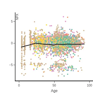Blood protein levels by age, BMI, and sex, measured using the proximity extension assay (PEA) with the Olink Explore 1536. In the age and sex scatterplots, samples are colored by disease class.