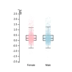 Blood protein levels in 96 healthy adults (aged 50–65) measured at six visits over a two-year period, shown separately for males and females. Relative protein abundances were quantified using the proximity extension assay (PEA) with the Olink Explore HT.