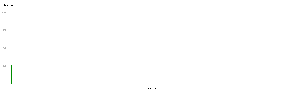 At the top of the view, the position of the antigen (identified by the corresponding HPA identifier) is shown as a green bar. A yellow triangle on the bar indicates a <100% sequence identity to the protein target.