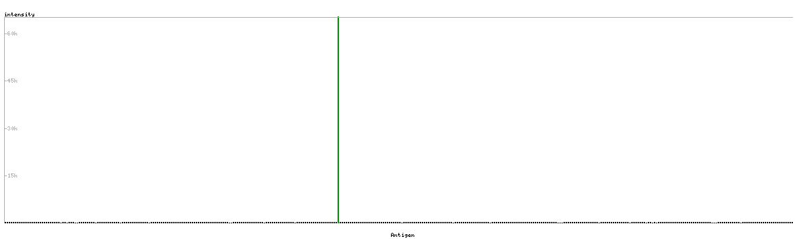 At the top of the view, the position of the antigen (identified by the corresponding HPA identifier) is shown as a green bar. A yellow triangle on the bar indicates a <100% sequence identity to the protein target.