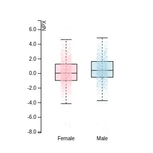 Blood protein levels in 96 healthy adults (aged 50–65) measured at six visits over a two-year period, shown separately for males and females. Relative protein abundances were quantified using the proximity extension assay (PEA) with the Olink Explore HT.
