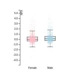 Blood protein levels in 96 healthy adults (aged 50–65) measured at six visits over a two-year period, shown separately for males and females. Relative protein abundances were quantified using the proximity extension assay (PEA) with the Olink Explore HT.