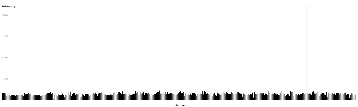 At the top of the view, the position of the antigen (identified by the corresponding HPA identifier) is shown as a green bar. A yellow triangle on the bar indicates a <100% sequence identity to the protein target.