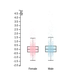 Blood protein levels in 96 healthy adults (aged 50–65) measured at six visits over a two-year period, shown separately for males and females. Relative protein abundances were quantified using the proximity extension assay (PEA) with the Olink Explore HT.
