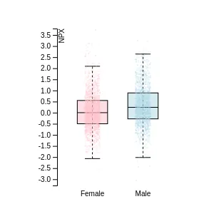 Blood protein levels in 96 healthy adults (aged 50–65) measured at six visits over a two-year period, shown separately for males and females. Relative protein abundances were quantified using the proximity extension assay (PEA) with the Olink Explore HT.
