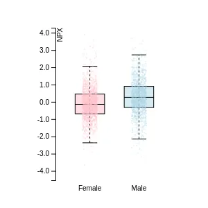 A gene is classified as upregulated in a disease if the average concentration of all samples of that disease is significantly higher (adj P-value<0.005 and NPX difference>=1) than the average concentration of samples of all diseases as measured by PEA . For gender specific diseases the analysis includes only samples corresponding to the same gender from the other diseases.