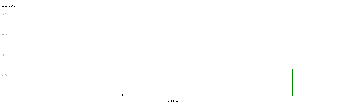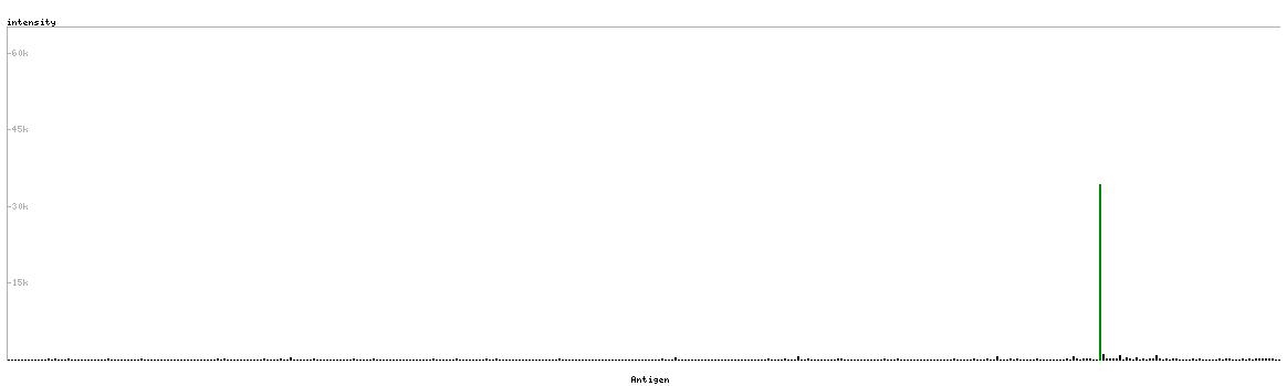 At the top of the view, the position of the antigen (identified by the corresponding HPA identifier) is shown as a green bar. A yellow triangle on the bar indicates a <100% sequence identity to the protein target.