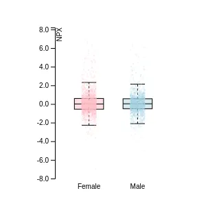 Blood protein levels in 96 healthy adults (aged 50–65) measured at six visits over a two-year period, shown separately for males and females. Relative protein abundances were quantified using the proximity extension assay (PEA) with the Olink Explore HT.