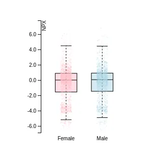 Blood protein levels in 96 healthy adults (aged 50–65) measured at six visits over a two-year period, shown separately for males and females. Relative protein abundances were quantified using the proximity extension assay (PEA) with the Olink Explore HT.