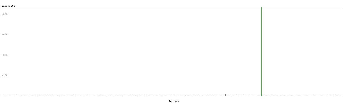 At the top of the view, the position of the antigen (identified by the corresponding HPA identifier) is shown as a green bar. A yellow triangle on the bar indicates a <100% sequence identity to the protein target.