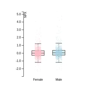 Blood protein levels in 96 healthy adults (aged 50–65) measured at six visits over a two-year period, shown separately for males and females. Relative protein abundances were quantified using the proximity extension assay (PEA) with the Olink Explore HT.