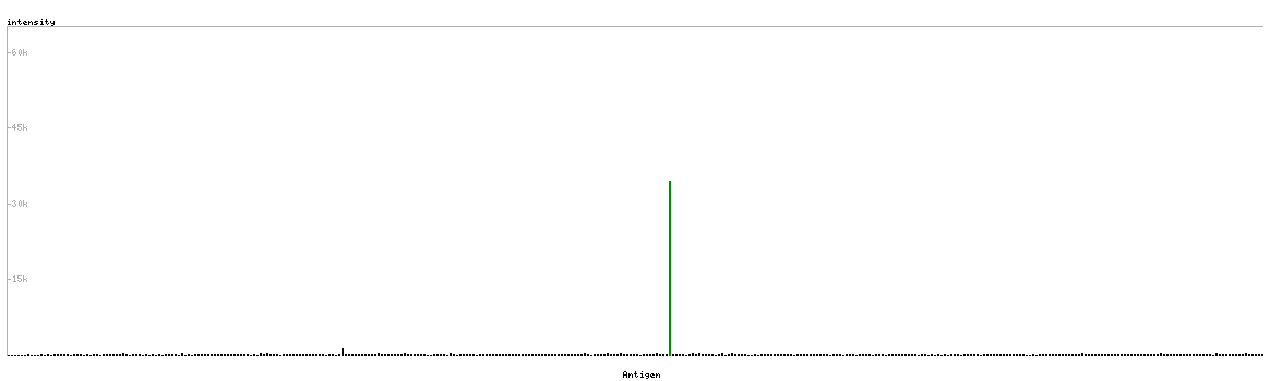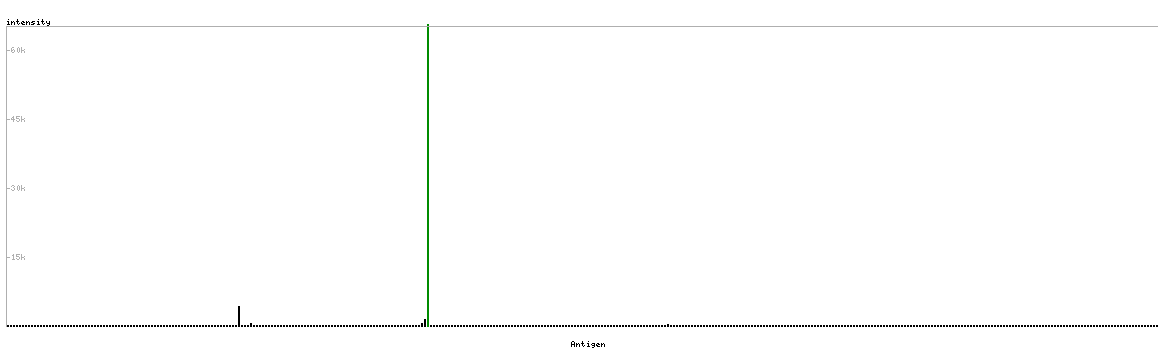 At the top of the view, the position of the antigen (identified by the corresponding HPA identifier) is shown as a green bar. A yellow triangle on the bar indicates a <100% sequence identity to the protein target.