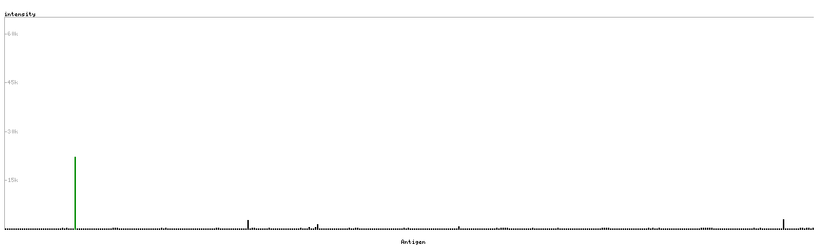 At the top of the view, the position of the antigen (identified by the corresponding HPA identifier) is shown as a green bar. A yellow triangle on the bar indicates a <100% sequence identity to the protein target.