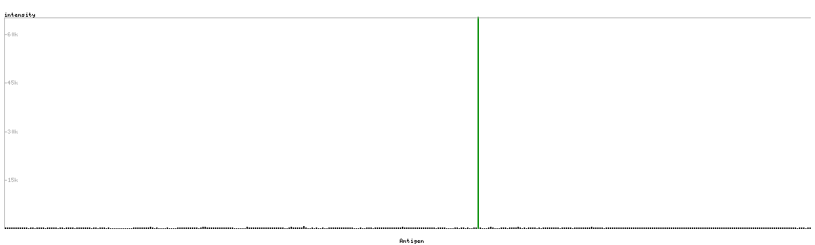 At the top of the view, the position of the antigen (identified by the corresponding HPA identifier) is shown as a green bar. A yellow triangle on the bar indicates a <100% sequence identity to the protein target.