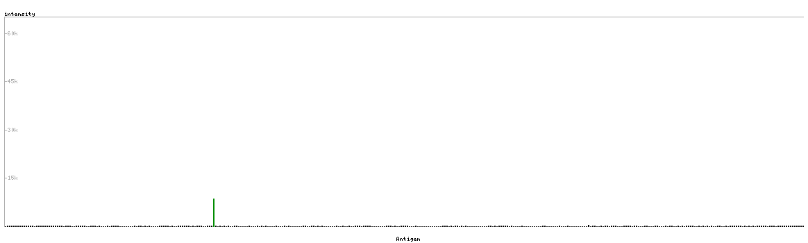 At the top of the view, the position of the antigen (identified by the corresponding HPA identifier) is shown as a green bar. A yellow triangle on the bar indicates a <100% sequence identity to the protein target.