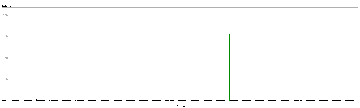 At the top of the view, the position of the antigen (identified by the corresponding HPA identifier) is shown as a green bar. A yellow triangle on the bar indicates a <100% sequence identity to the protein target.