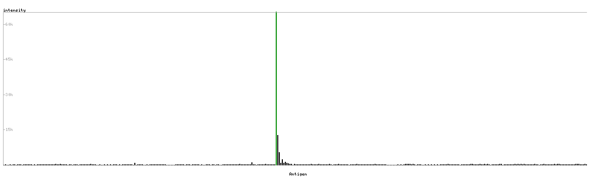 At the top of the view, the position of the antigen (identified by the corresponding HPA identifier) is shown as a green bar. A yellow triangle on the bar indicates a <100% sequence identity to the protein target.