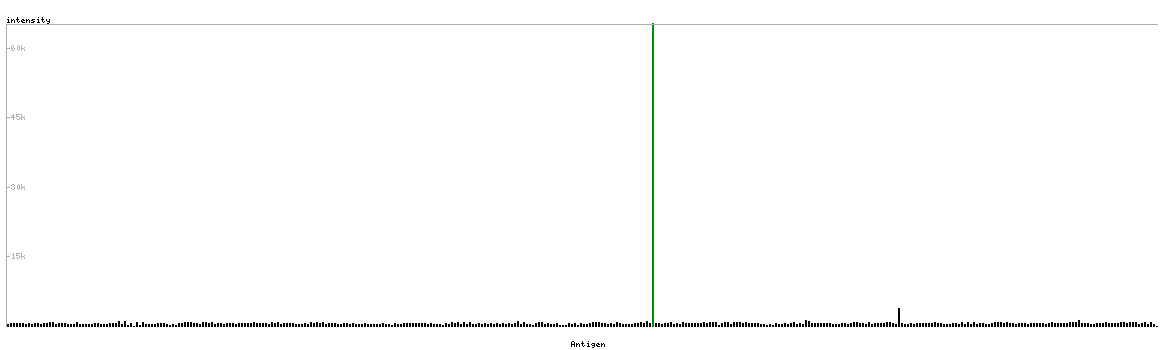 At the top of the view, the position of the antigen (identified by the corresponding HPA identifier) is shown as a green bar. A yellow triangle on the bar indicates a <100% sequence identity to the protein target.