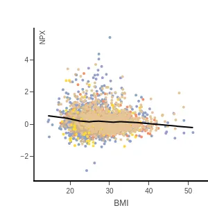 Blood protein levels by age, BMI, and sex, measured using the proximity extension assay (PEA) with the Olink Explore 1536. In the age and sex scatterplots, samples are colored by disease class.