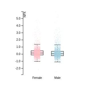 Blood protein levels in 96 healthy adults (aged 50–65) measured at six visits over a two-year period, shown separately for males and females. Relative protein abundances were quantified using the proximity extension assay (PEA) with the Olink Explore HT.