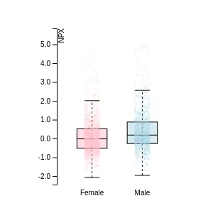 Blood protein levels in 96 healthy adults (aged 50–65) measured at six visits over a two-year period, shown separately for males and females. Relative protein abundances were quantified using the proximity extension assay (PEA) with the Olink Explore HT.