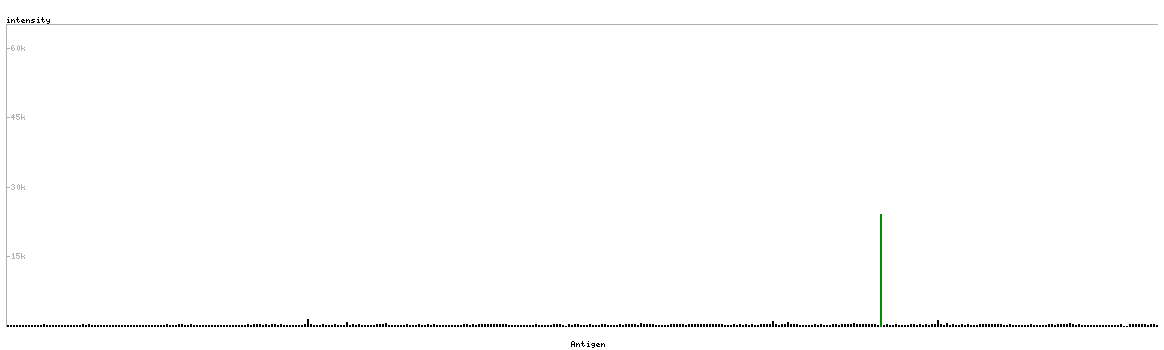 At the top of the view, the position of the antigen (identified by the corresponding HPA identifier) is shown as a green bar. A yellow triangle on the bar indicates a <100% sequence identity to the protein target.