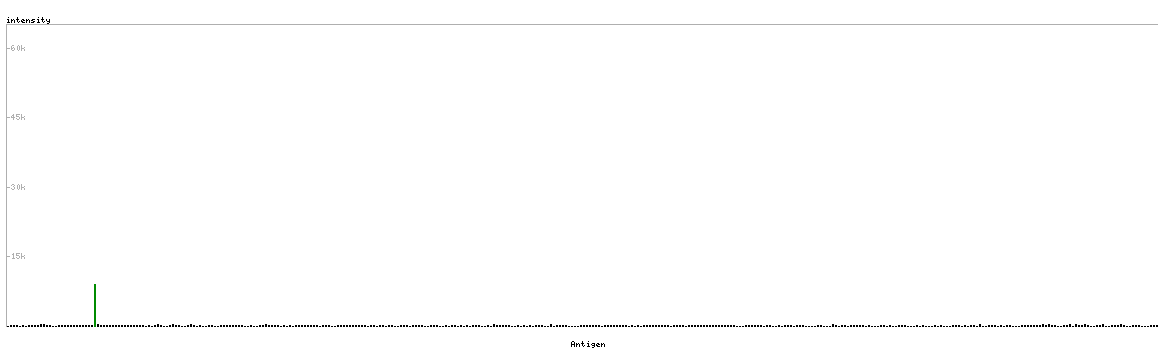 At the top of the view, the position of the antigen (identified by the corresponding HPA identifier) is shown as a green bar. A yellow triangle on the bar indicates a <100% sequence identity to the protein target.