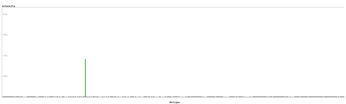 At the top of the view, the position of the antigen (identified by the corresponding HPA identifier) is shown as a green bar. A yellow triangle on the bar indicates a <100% sequence identity to the protein target.