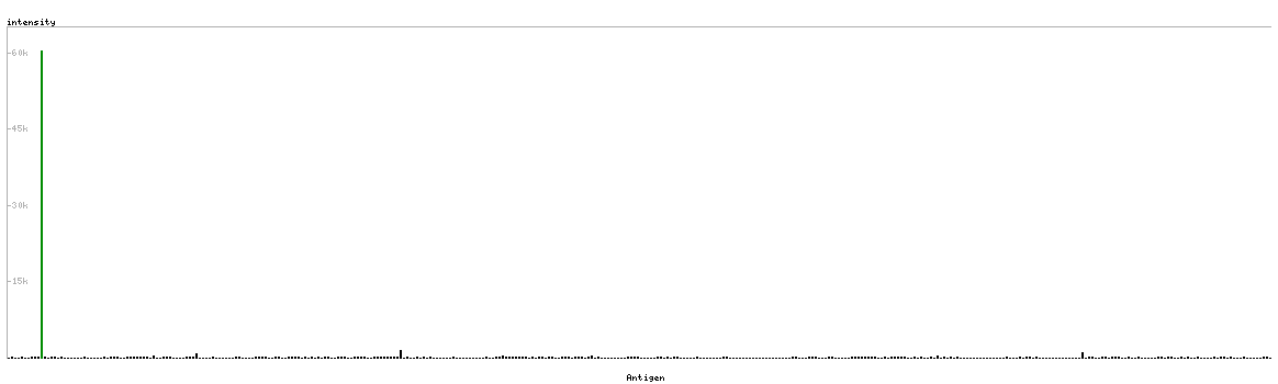 At the top of the view, the position of the antigen (identified by the corresponding HPA identifier) is shown as a green bar. A yellow triangle on the bar indicates a <100% sequence identity to the protein target.
