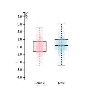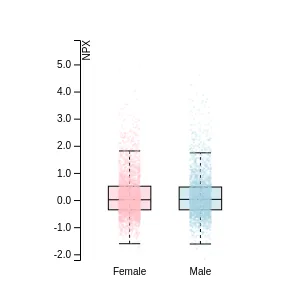 Blood protein levels in 96 healthy adults (aged 50–65) measured at six visits over a two-year period, shown separately for males and females. Relative protein abundances were quantified using the proximity extension assay (PEA) with the Olink Explore HT.