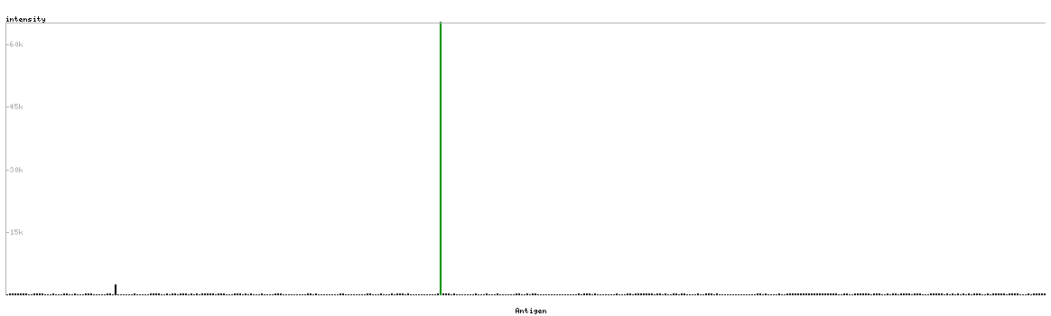 At the top of the view, the position of the antigen (identified by the corresponding HPA identifier) is shown as a green bar. A yellow triangle on the bar indicates a <100% sequence identity to the protein target.