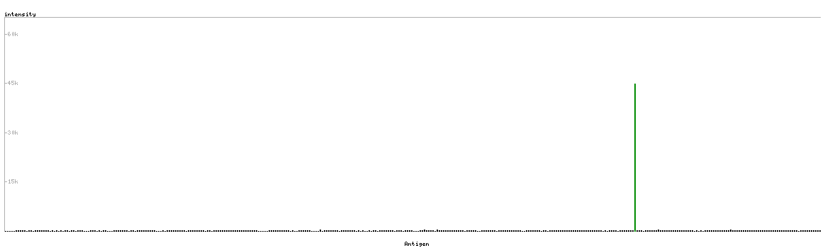 At the top of the view, the position of the antigen (identified by the corresponding HPA identifier) is shown as a green bar. A yellow triangle on the bar indicates a <100% sequence identity to the protein target.