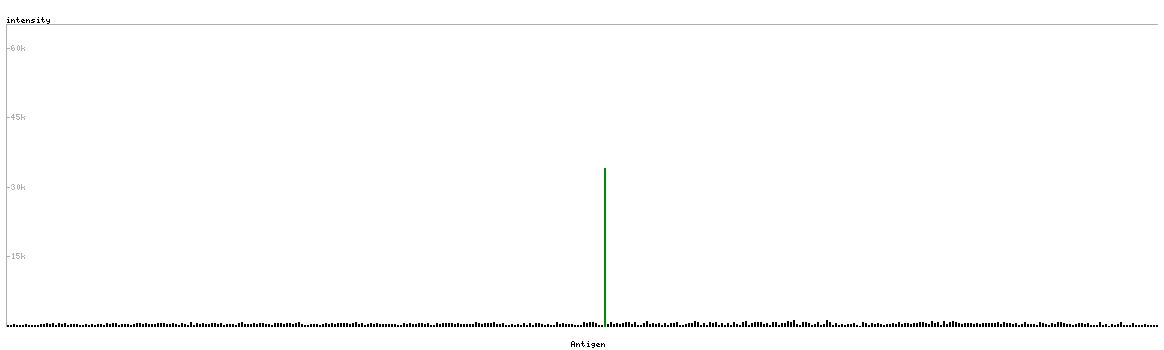 At the top of the view, the position of the antigen (identified by the corresponding HPA identifier) is shown as a green bar. A yellow triangle on the bar indicates a <100% sequence identity to the protein target.