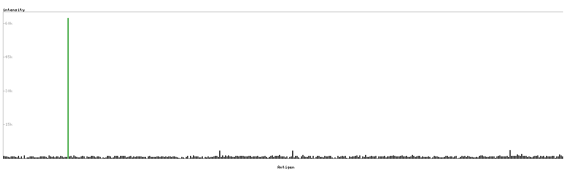 At the top of the view, the position of the antigen (identified by the corresponding HPA identifier) is shown as a green bar. A yellow triangle on the bar indicates a <100% sequence identity to the protein target.