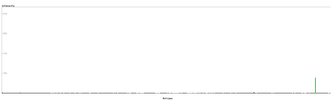 At the top of the view, the position of the antigen (identified by the corresponding HPA identifier) is shown as a green bar. A yellow triangle on the bar indicates a <100% sequence identity to the protein target.