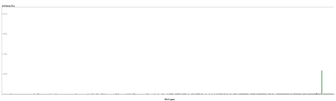 At the top of the view, the position of the antigen (identified by the corresponding HPA identifier) is shown as a green bar. A yellow triangle on the bar indicates a <100% sequence identity to the protein target.