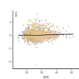 Blood protein levels by age, BMI, and sex, measured using the proximity extension assay (PEA) with the Olink Explore 1536. In the age and sex scatterplots, samples are colored by disease class.
